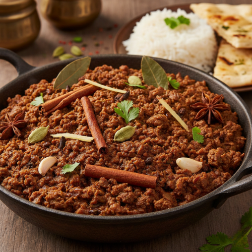 Minced mutton slow-cooked with ginger, garlic, and whole spices in a thick masala curry. Earthy and