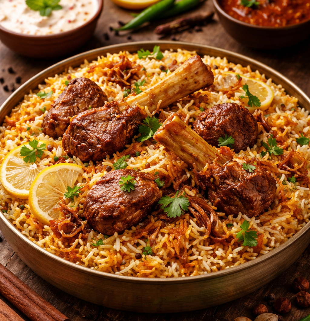 Bone-in mutton simmered in a rich, traditional masala and layered with fragrant rice. A royal treat