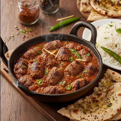 Flavor-packed mutton seekh kebabs simmered in a thick, spicy masala. A bold and satisfying choice