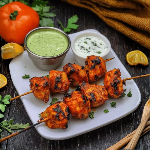 Boneless chicken pieces marinated in tandoori spices and grilled in tandoor. Smoky, spicy, and